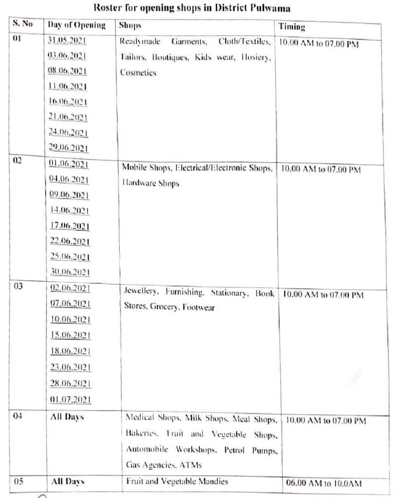 The new directions, effective from 31-05-2021, allow opening of various shops in the entire district but strictly as per the given roster.