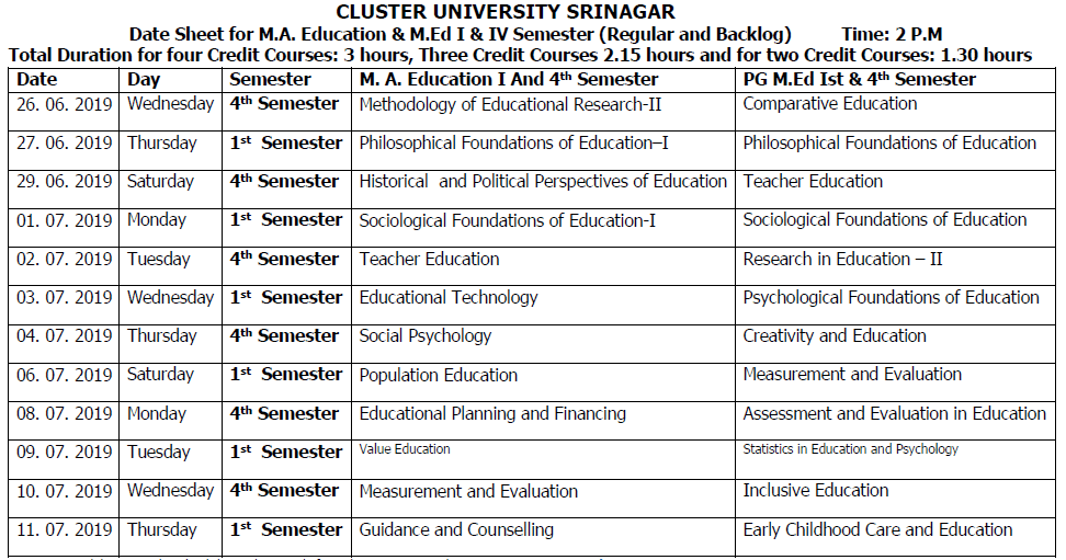 SRINAGAR — Cluster University of Srinagar has released the CUS Date Sheet for M.A Education & M.Ed – I & IV Semester (2019).