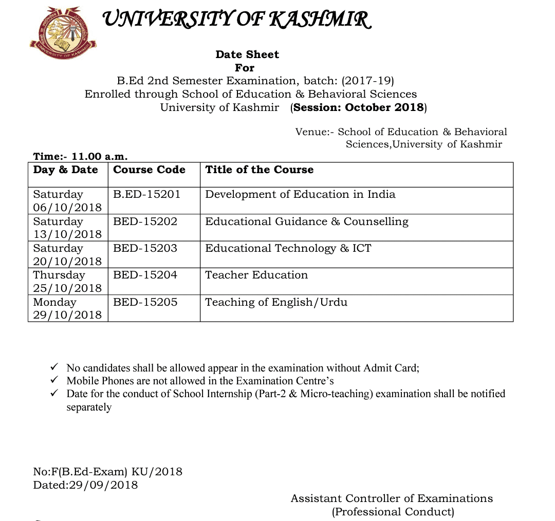 Srinagar: University of Kashmir has released the Date Sheet for B.Ed 2nd Semester Exam 2018 (School of Education & Behavioral Sciences).