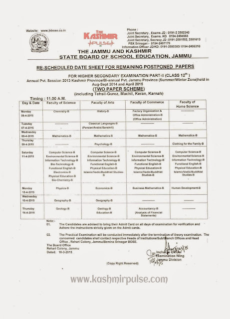 Rescheduled Datesheet for remaining postponed papers of Class 12th